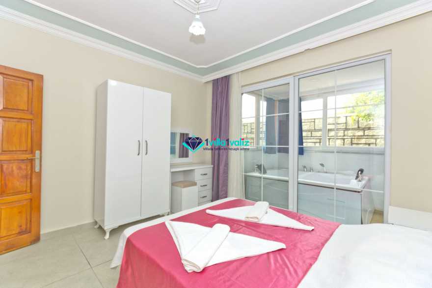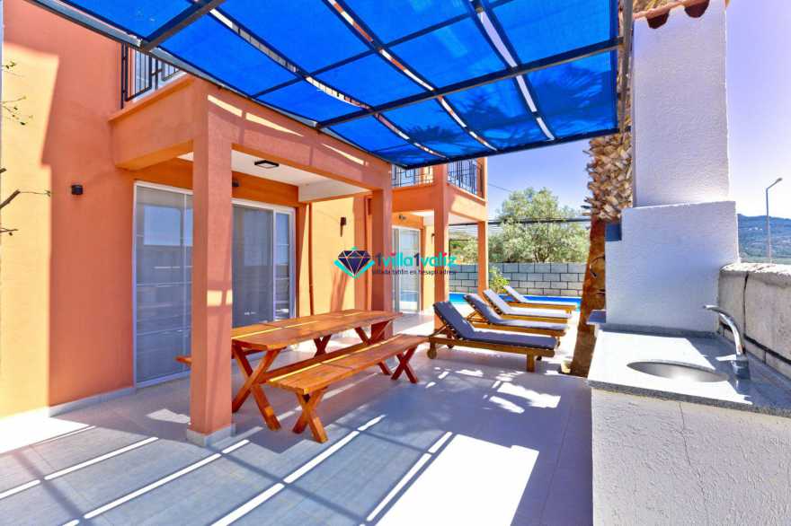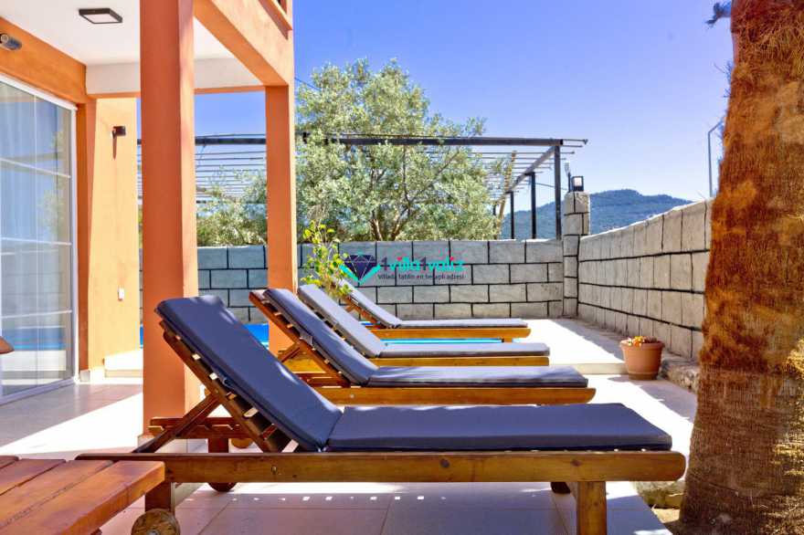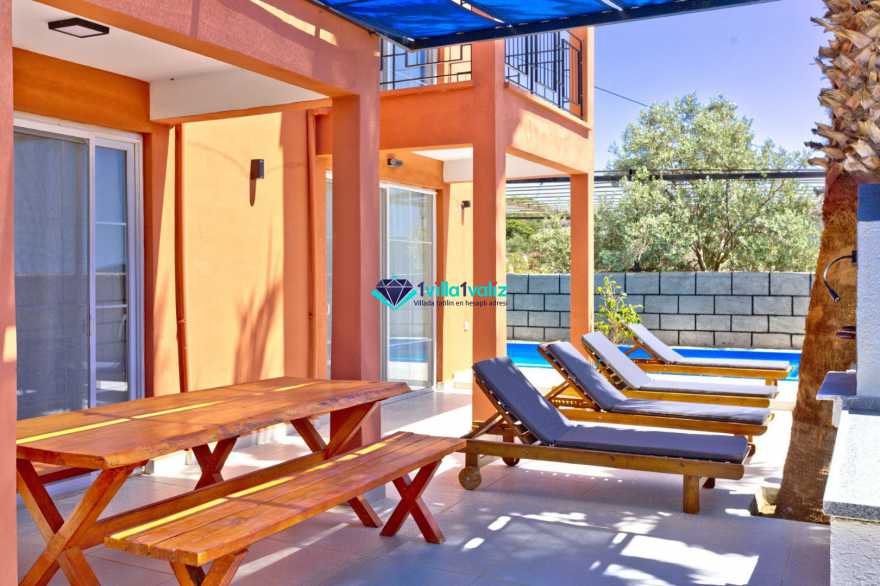 Antalya'da Kaş'ın Patara mevkiinde kalabalık arkadaş grupları ya da geniş aileler için uygun olan villamız, özel yüzme havuzu, oda içi jakuzi, havuz başı terasta barbekü (mangal), 4 yatak odası, 2 ebeveyn banyo & tuvaleti, 1 ortak banyo & tuvalet ile 8 kişilik konaklama kapasitesine sahiptir. Villamızın geniş bir havuz teras alanı bulunmakta olup her odanın kendine ait özel bir balkonu bulanmaktadır. Yine villamızda size ait özel havuzun dışında tesisimiz bünyesinde yer alan ortak bir alanda hem çocuk hem de yetişkinler için bir yüzme havuzu daha size hizmet vermektedir. Doğa içerisinde yer alan villamızın tamamı böcek, sinek, kelebek, haşereler vb. için düzenli olarak ilaçlanmakta olup tüm kapı ve pencereler sivrisinek korunaklıdır. Denize uzaklığı araçla 5 dk. mesafede yer alan villamızda huzur dolu bir tatil sizleri bekliyor.