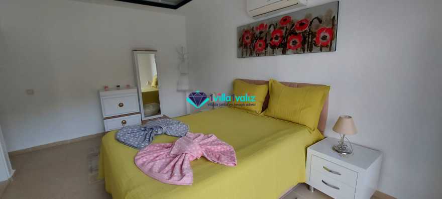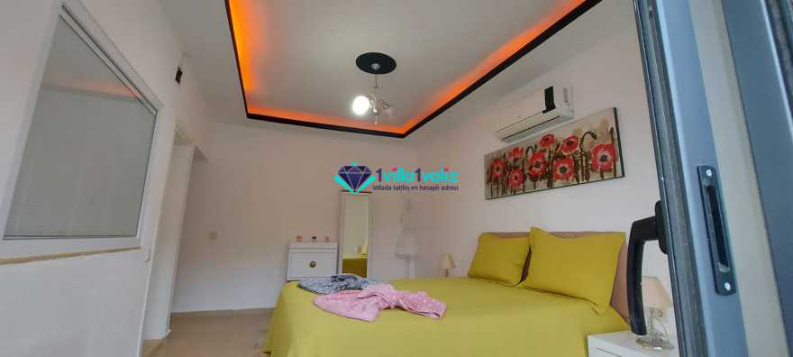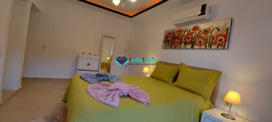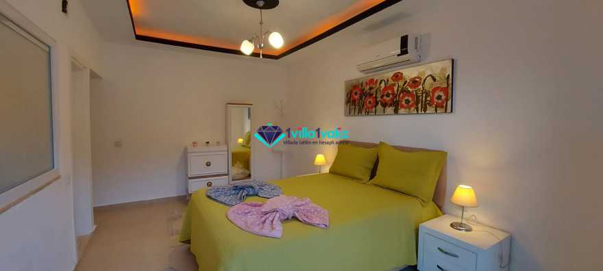 1. Yatak Odası: İki kişilik yatakla beraber sizleri sıcak yaz günlerinde serin tutması için bakımları yapılmış klima ile terası da bulunmaktadır. Elbise dolabı, makyaj masası, komodin, banyo ve lavabodan oluşmaktadır. Yatak odamızda jakuzi vardır.