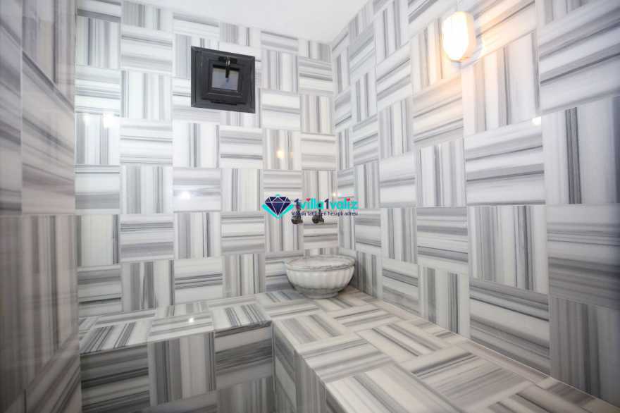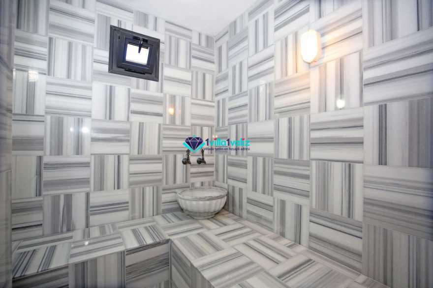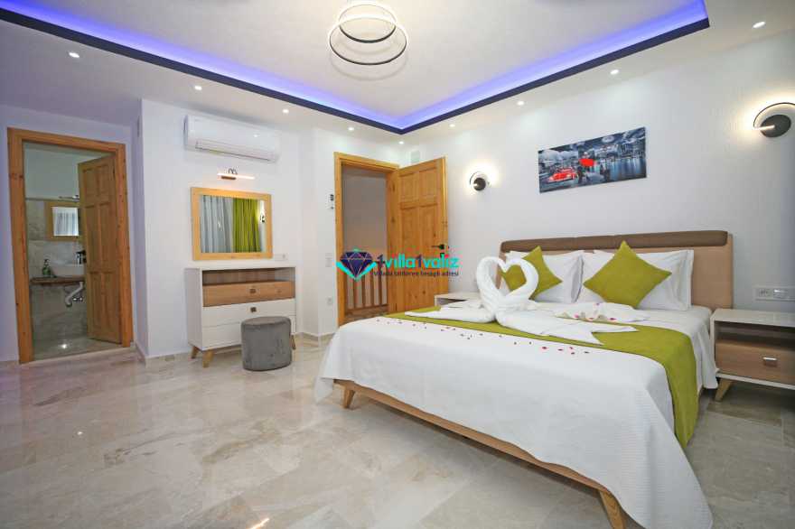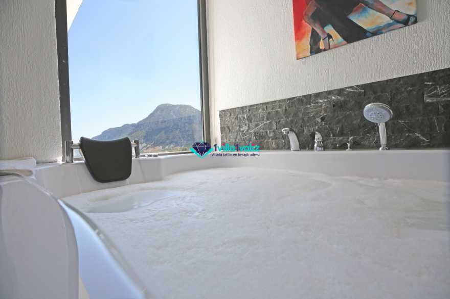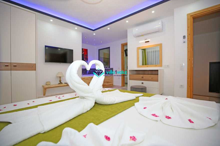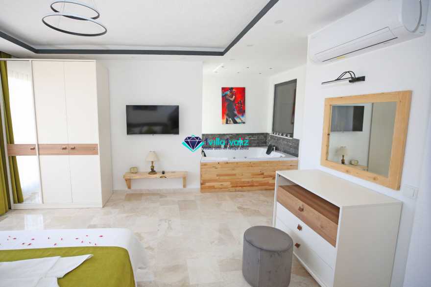 Korunaklı havuz alanına sahip villamızın ebeveyn yatak odasında jakuzi bulunmaktadır.