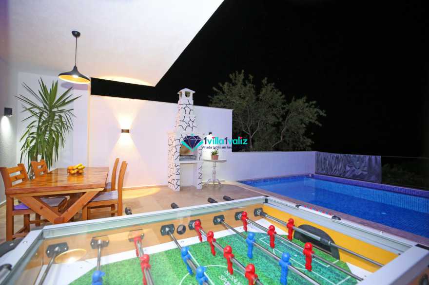 Havuz ve Bahçe Detayı : 8 m x 4 m x 3, 5 m ölçülerinde özel korunaklı yüzme havuzu, şezlonglar, şemsiye, dış mekan oturma grubu, BBQ, salıncak, masa tenisi, çocuk oyun alanı ve çocuk havuzu bulunmaktadır.