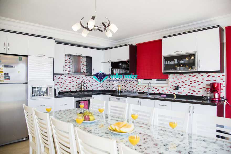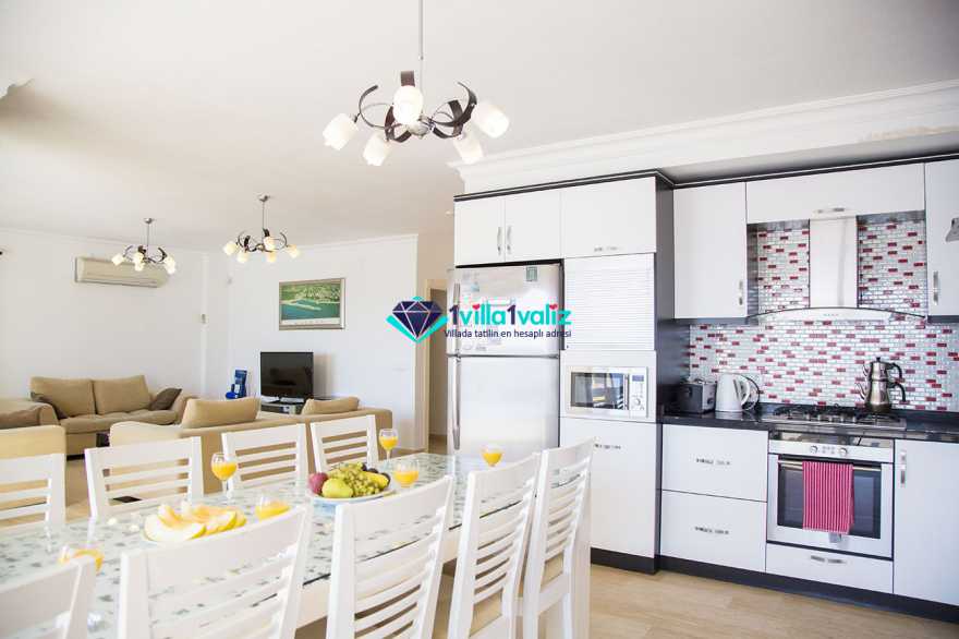 Modern Amerikan mutfakta, bulaşık makinesi, çamaşır makinesi, mikrodalga fırın, ankastre fırın, ankastre 4’lü ocak, buzdolabı, elektrikli su ısıtıcı (kettle), ekmek kızartma makinesi, tencere ve tava takımı, 10 kişilik yemek takımı, kaşık ve çatal seti ve bardaklar bulunmaktadır. Mutfak bölümünden de havuz terasına çıkılabilmektedir.