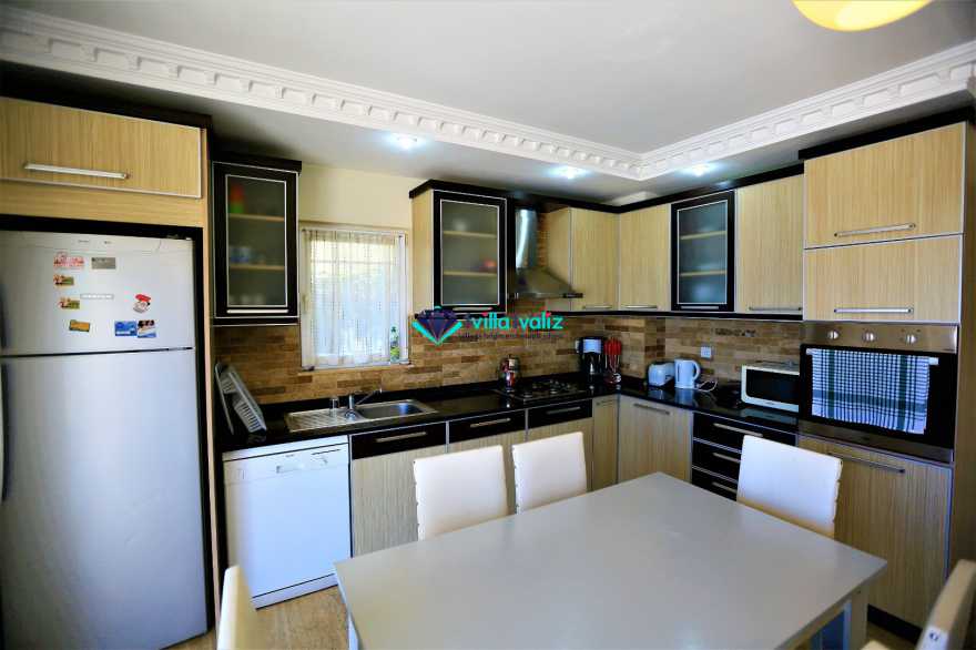 Mutfak: Modern ve geniş Amerikan mutfak Buz dolabı, Bulaşık makinesi, Fırın, 4’lü Ocak (ankastre), Elektrikli su ısıtıcı,Kahve makinesi, 10 kişilik yemek takımı, Tava, Tencereler, Çatal bıçak vb.