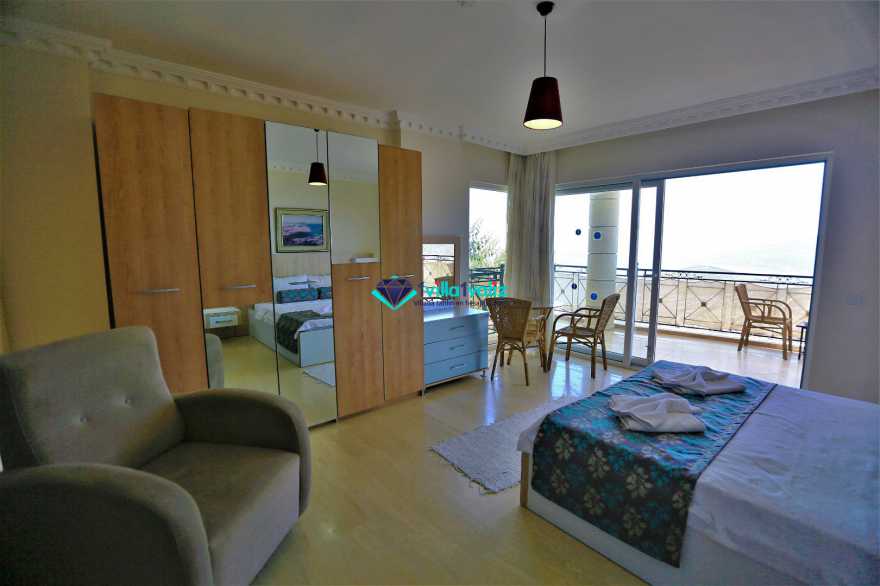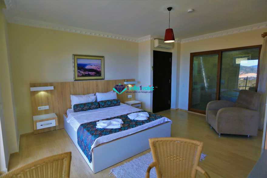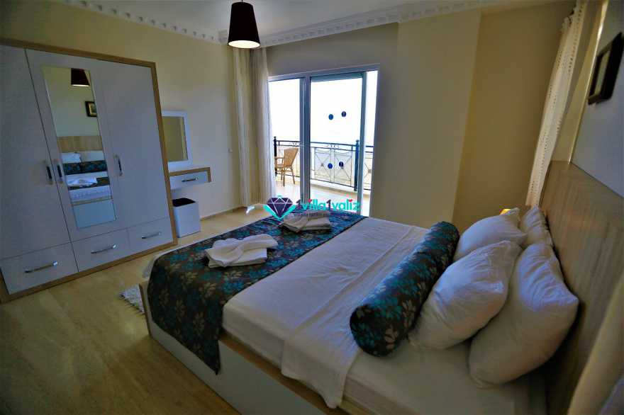 1. Yatak Odası: Çift kişilik yatak, klima ,banyo, elbise dolabı, makyaj masası, komidin bulunmaktadır. Deniz manzaralı yatak odası.