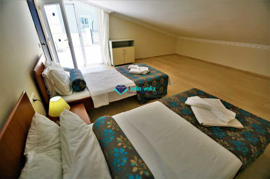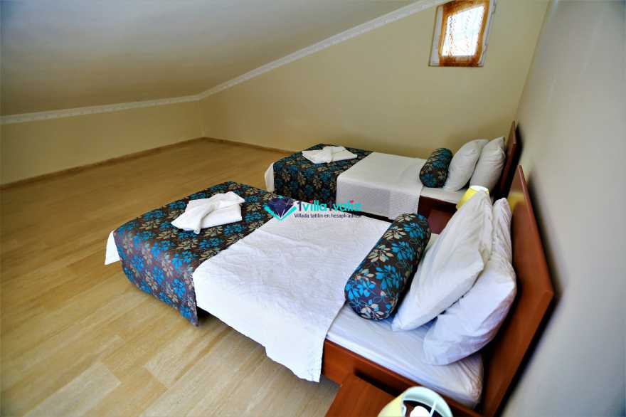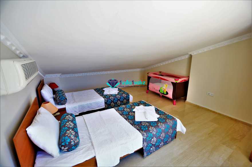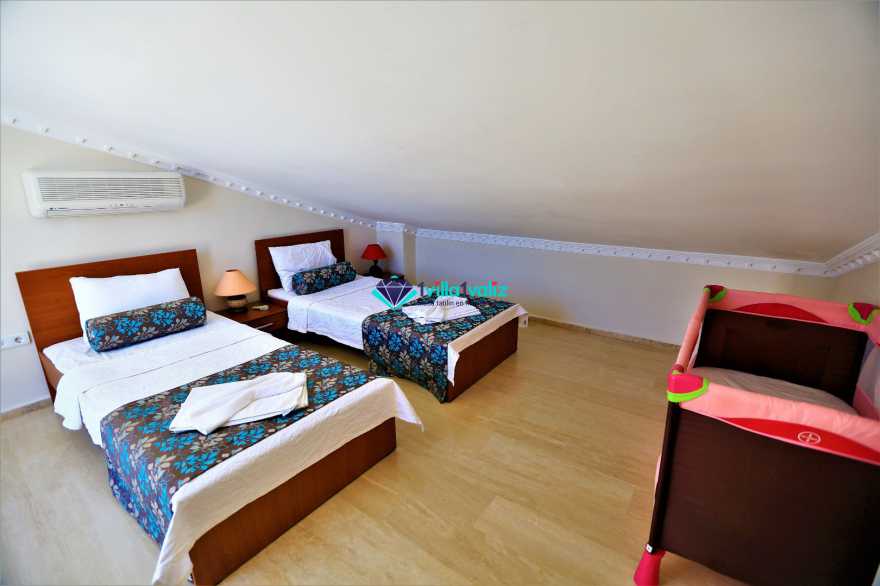 3. Yatak Odası: 2 Adet tek kişilik yatak(birleşebilir), Elbise dolabı, Komidin, Klima, ortak kullanım banyo. Deniz manzaralı yatak odası.