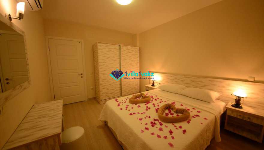 1.Yatak Odası: 1 adet çift kişilik yatak, klima, komodin, makyaj masası, elbise dolabı, banyo ve tuvalet bulunmaktadır.