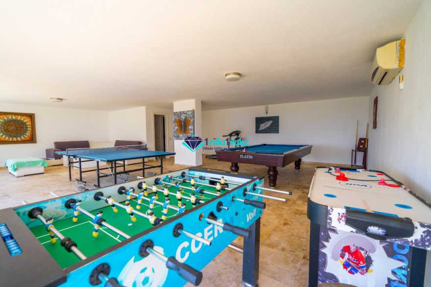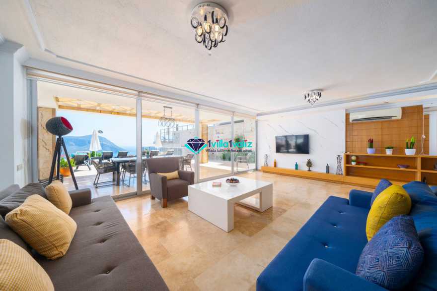 Salonda klima uydu alıcı, TV, DVD Player, oturma grubu, ütü ve ütü masası, lavabo yer almaktadır ve havuz kenarına çıkış vardır. Salon havuz katındadır. En üst katta dinlenmek ve güneşlenmek için çok geniş bir seyir terası daha vardır. Bu alanda da oturma gurubu, masa ve sandalye bulunur.