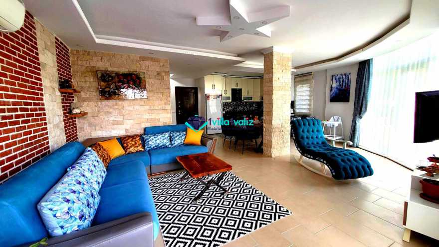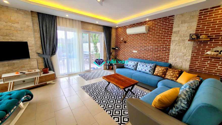 Villa Dere’nin salonunda sizi şık bir oturma grubu ile klima, tv, internet, uydu, koltuk, sehpa ile ferah bir salon bekliyor olacaktır. Havuz terasına çıkış yapılmaktadır.