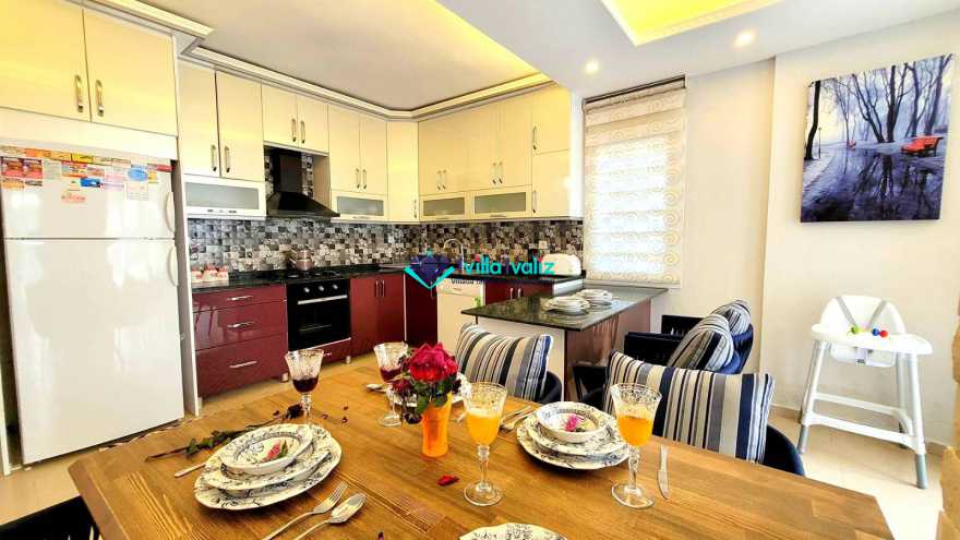 Villamızın geniş Amerikan mutfağı ile sizlere kendi evinizin mutfağı gibi hissettirecek. Ayrıca mutfakta klima, bulaşık makinası, buzdolabı, çamaşır makinası, mikrodalga fırın, tost makinası, ekmek kızartma, su ısıtıcısı, fırın, 4`lü ocak seti ve 6 kişilik geniş yemek masası ile tava tencere vb. mutfak araç gereçlerini kullanma fırsatını sizlere sunuyoruz.