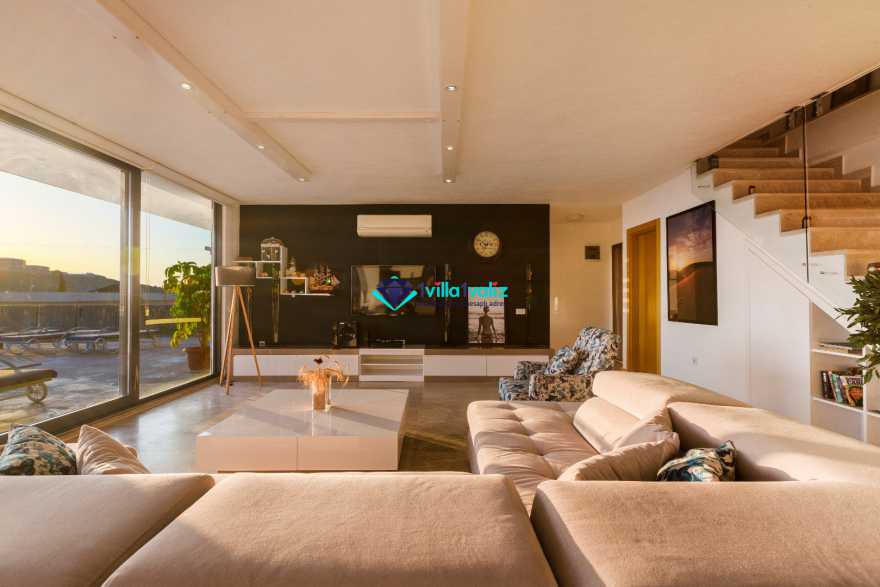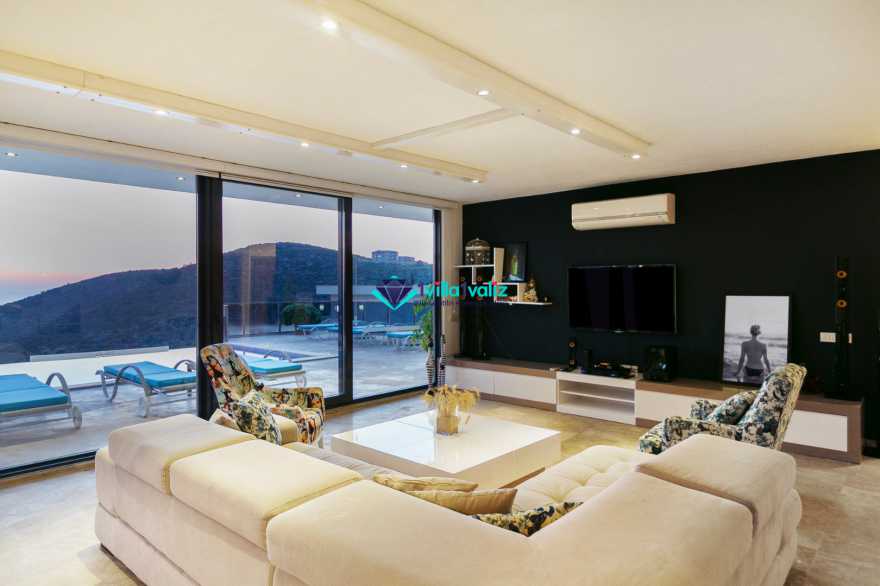 Villa Ela klimalı salonu deniz manzaralıdır. Salonda masa ve sandalyeler, LCD TV, uydu alıcı, ses sistemi, DVD player, oturma grubu, ütü ve ütü masası, lavabo, kablosuz modem, elektrik süpürgesi, lavabo ve tuvalet bulunmaktadır. Salondan havuz kenarına çıkış vardır.