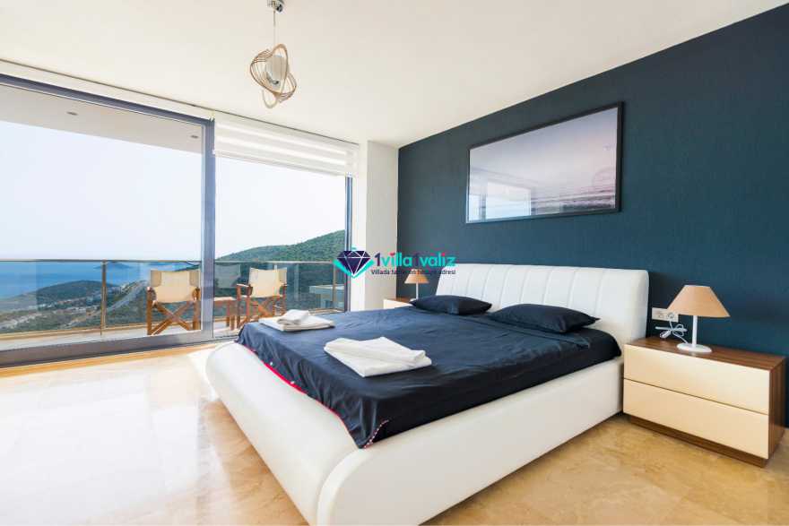 4. Yatak Odası: Yatak odasında makyaj masası, 1 adet çift kişilik yatak, elbise dolabı, jakuzi, banyo ve tuvalet bulunmaktadır. Deniz manzaralı balkon vardır ve balkonda oturma grubu yer almaktadır.