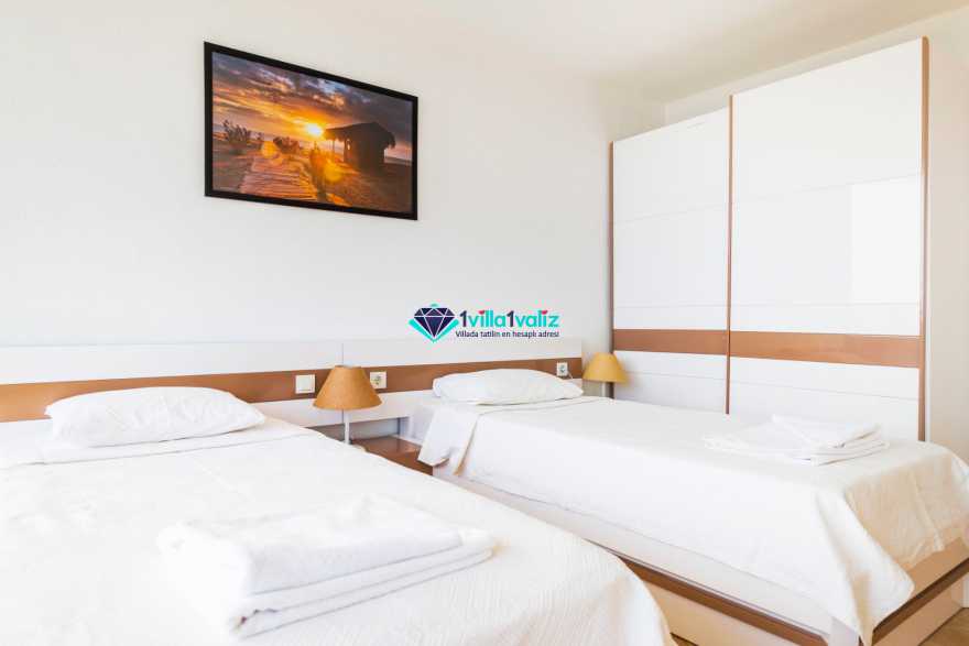3. Yatak Odası: Yatak odasında makyaj masası, 2 adet tek kişilik yatak, elbise dolabı, banyo ve tuvalet bulunmaktadır. Deniz manzaralı balkon vardır ve balkonda oturma grubu yer almaktadır.