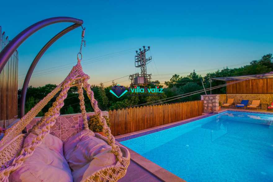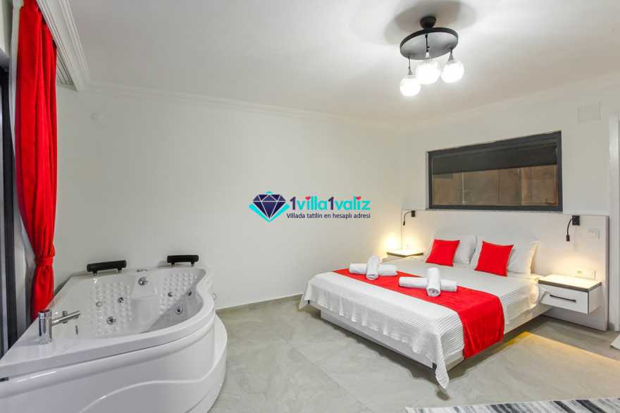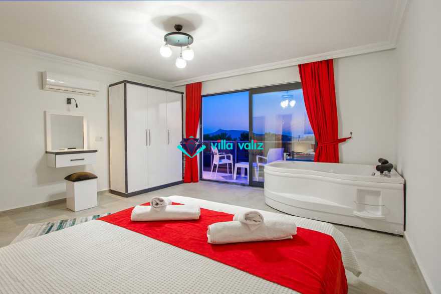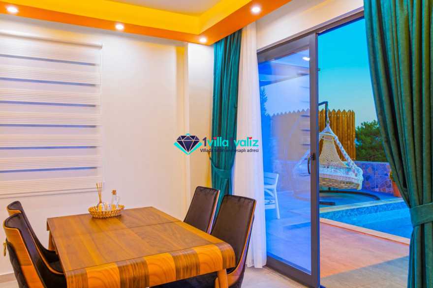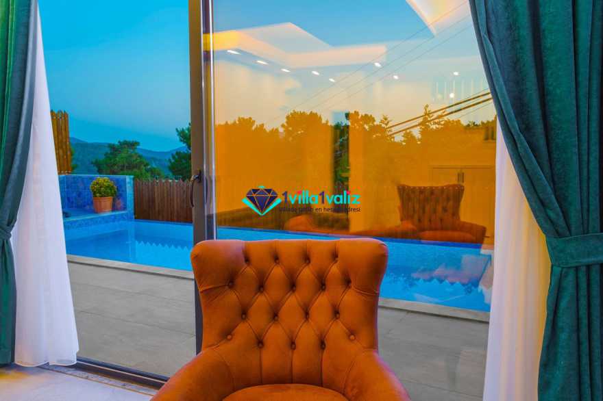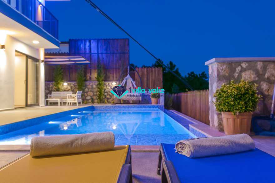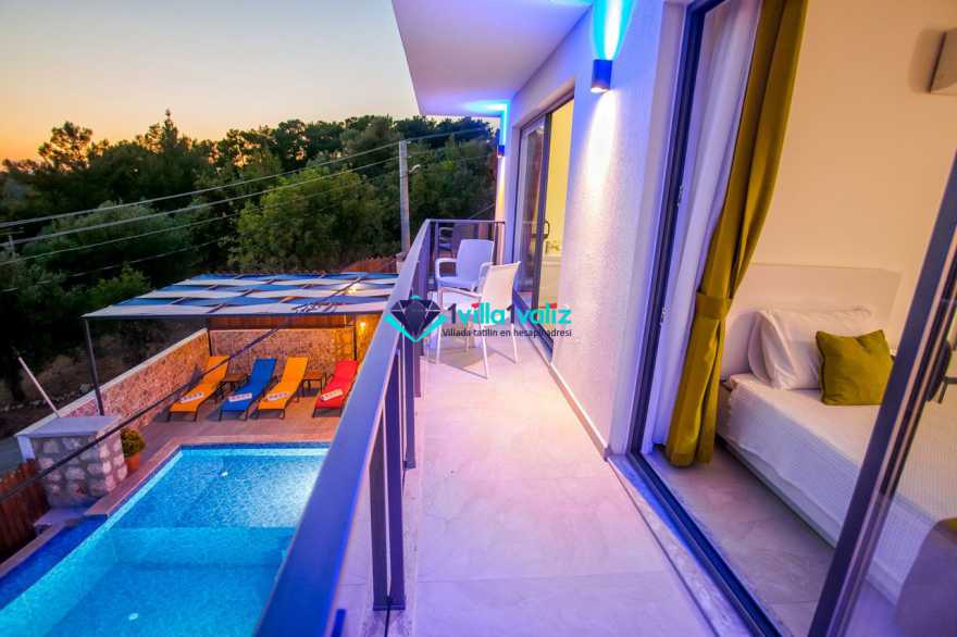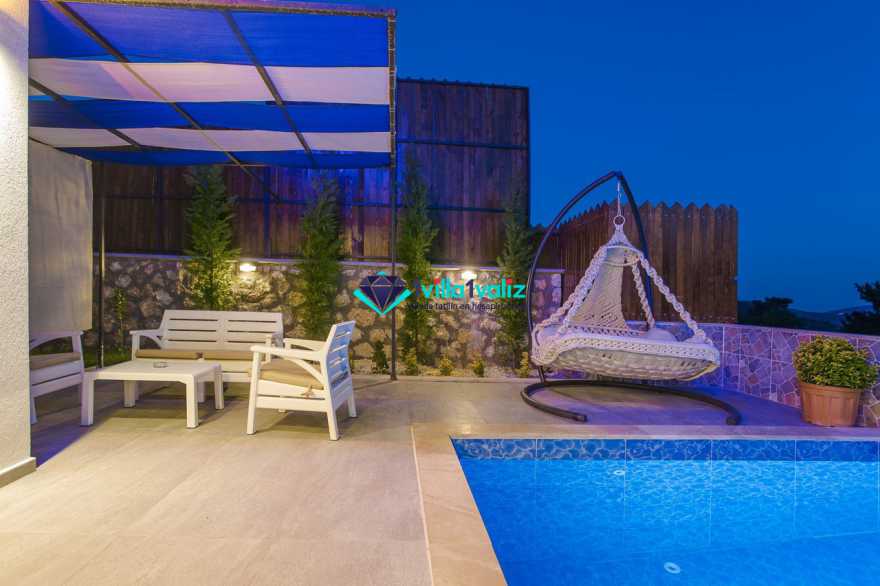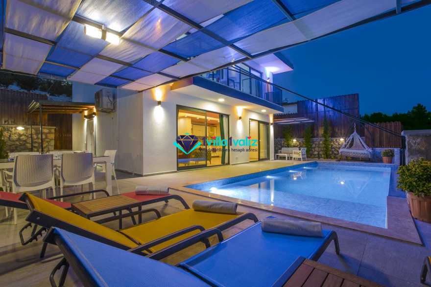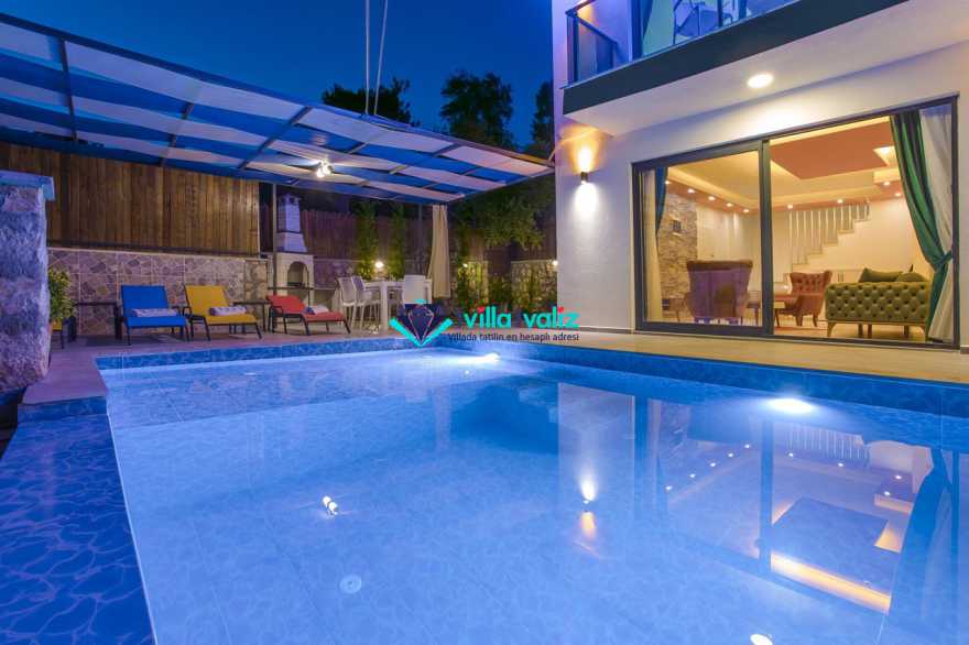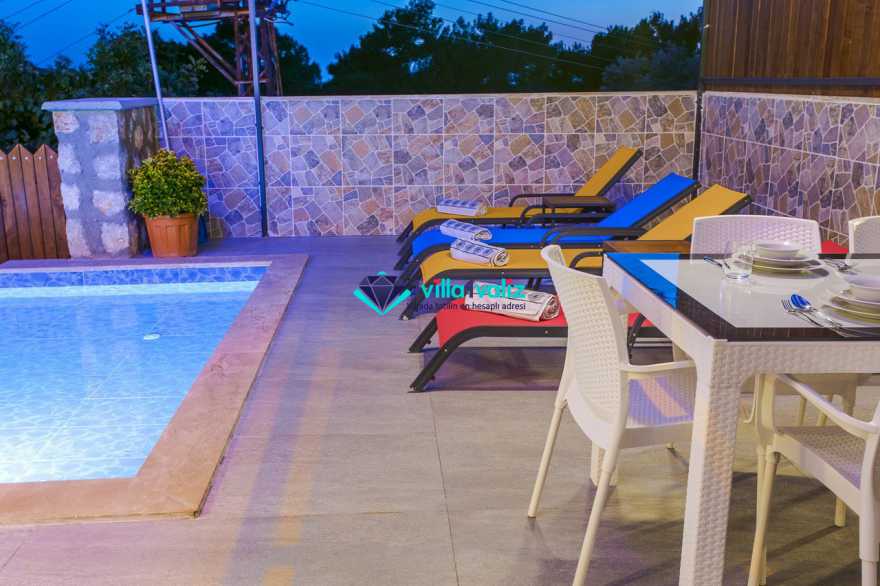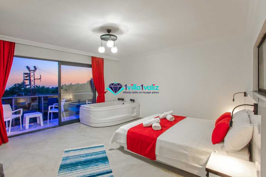 Villamız kalkan üzümlü bölgesinde konumlanmıştır. 2 yatak odalı 4 kişilik kapasiteye sahiptir. Muhafazakar aileler uygun özel yüzme havuzu ve havuz terası tamamen korunaklıdır. Balayı çiftlerine özel olarak süit yatak odasında jakuzi bulunmaktadır .Çocuklu aileler için oldukça uygun ve çocuk havuzu bulunmaktadır. Lüks eşyalar kullanılmıştır. Villamızın salonundan havuz terasında çıkış yapılmaktadır.