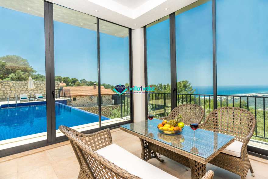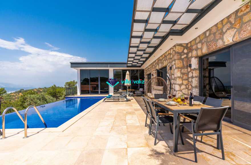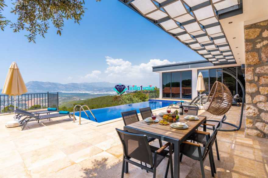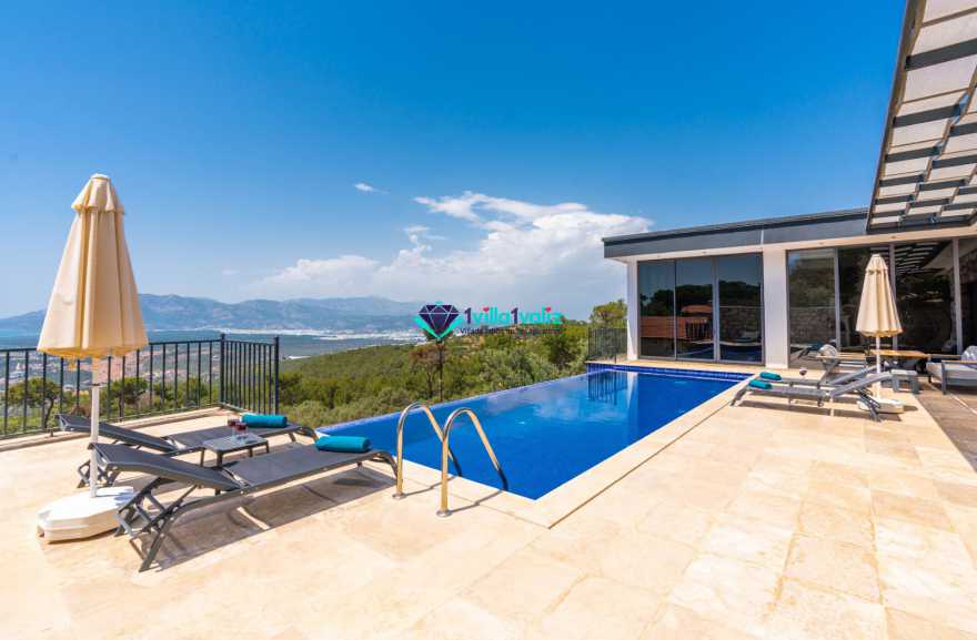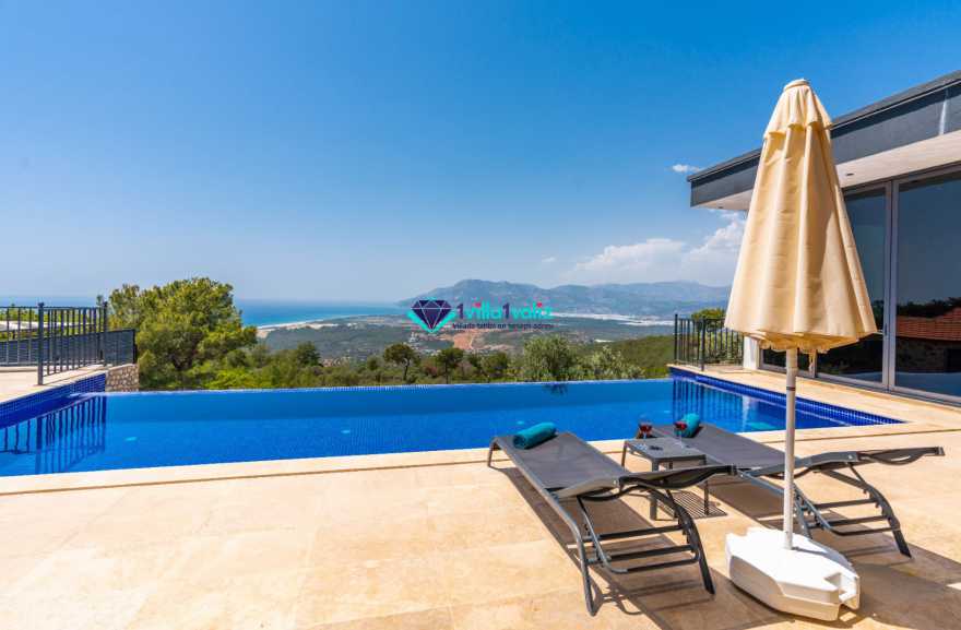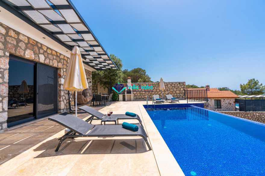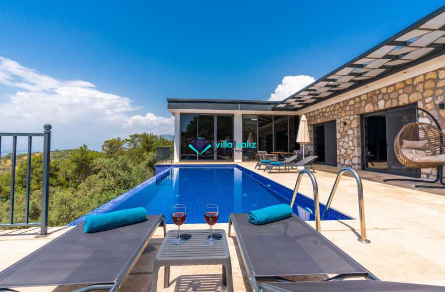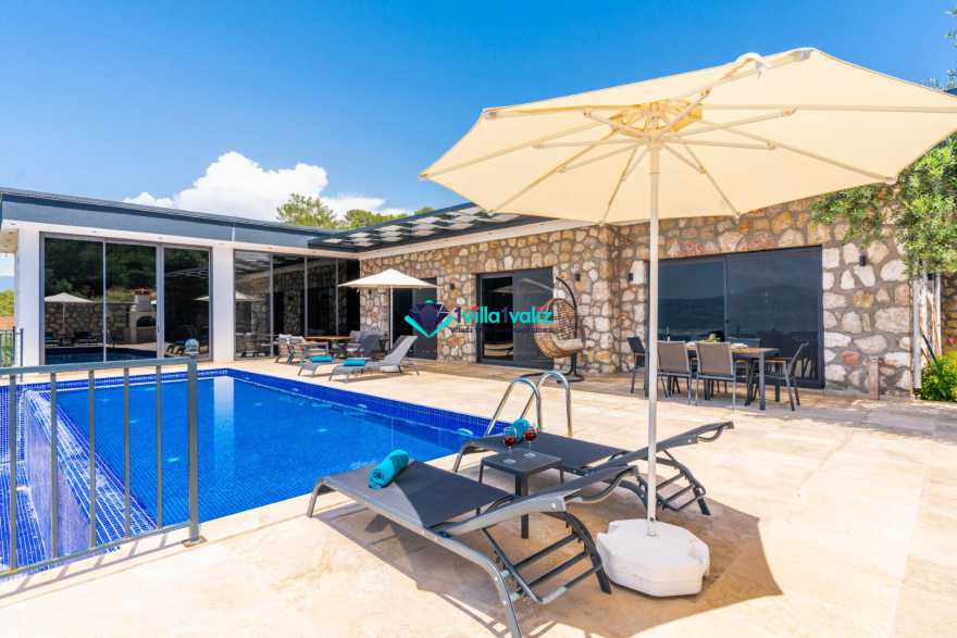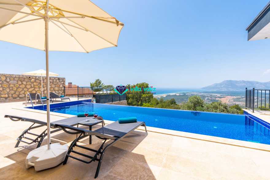 Villamız Kalkan Patara mevkiinde çam ağaçlarının arasında konumlanmıştır; doğa ve Patara denizi manzarasına panoramik açıdan sahip muhteşem villamızdır. Özel yüzme havuzu ve havuz terasında harika zamanlar geçirebileceğiniz gönlünüzce eğlenip güneşlenebileceğiniz bir ortama sahiptir. Villamızın etrafının korunaklı olması dolayısıyla havuz ve havuz terası dışarıdan gözükmemektedir.