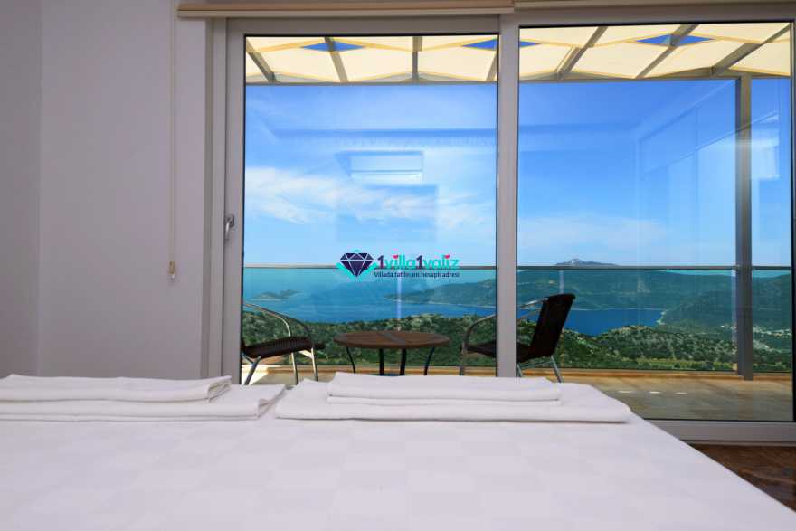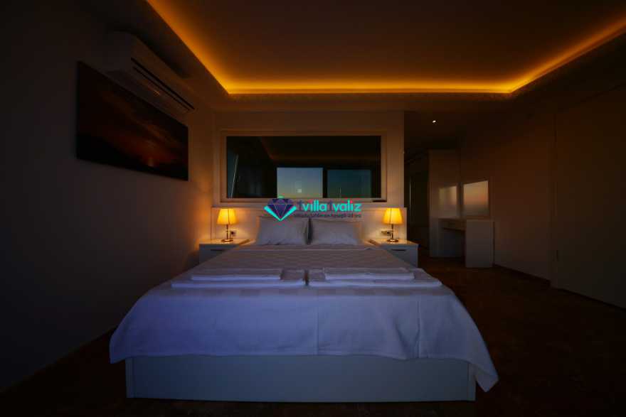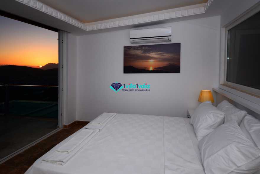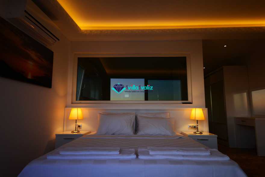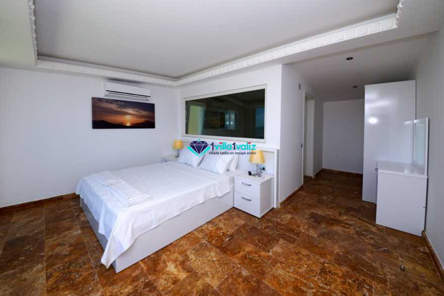 3. Yatak Odası (1. Kat) : Deniz manzaralı suit oda, 1 adet çift kişilik yatak, komidin, makyaj masası, klima, balkon, sehpa ve sandalyeler, banyo ve tuvalet bulunmaktadır.