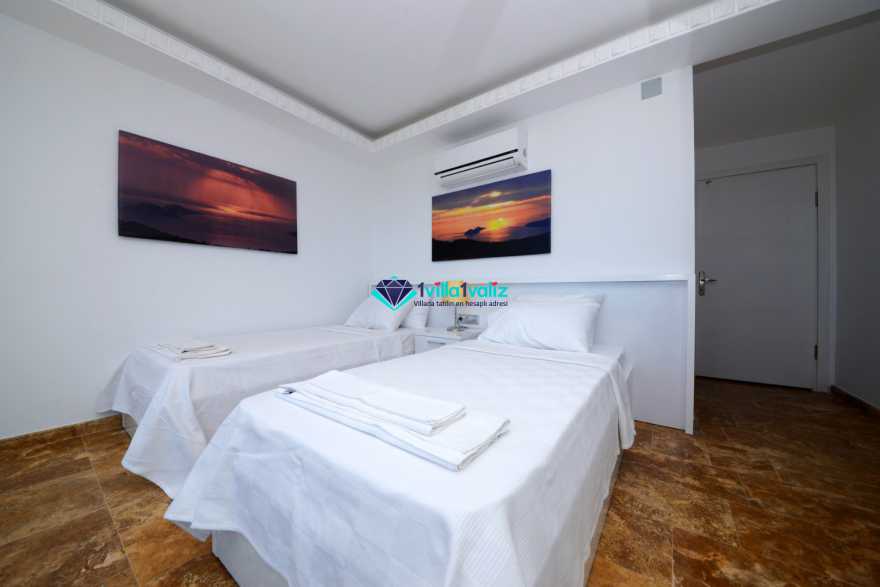 2. Yatak Odası (1. Kat) : Deniz manzaralı suit oda, 2 adet tek kişilik yatak, komidin, makyaj masası, klima, balkon, sehpa ve sandalyeler, banyo ve tuvalet bulunmaktadır.