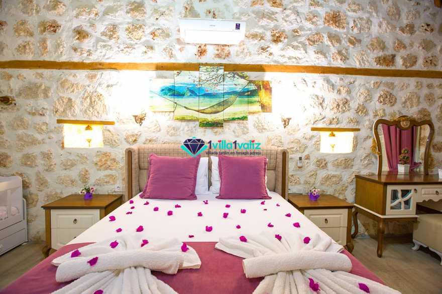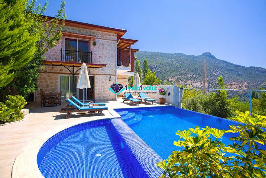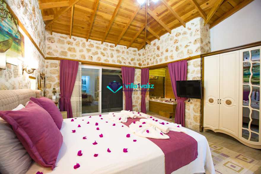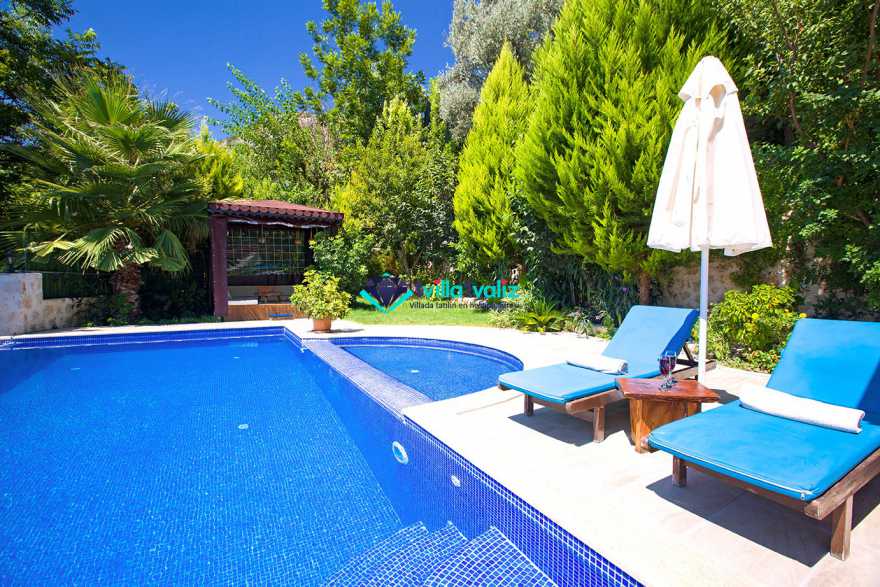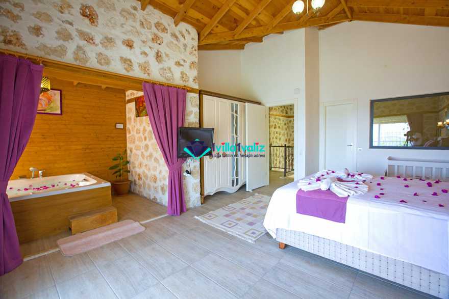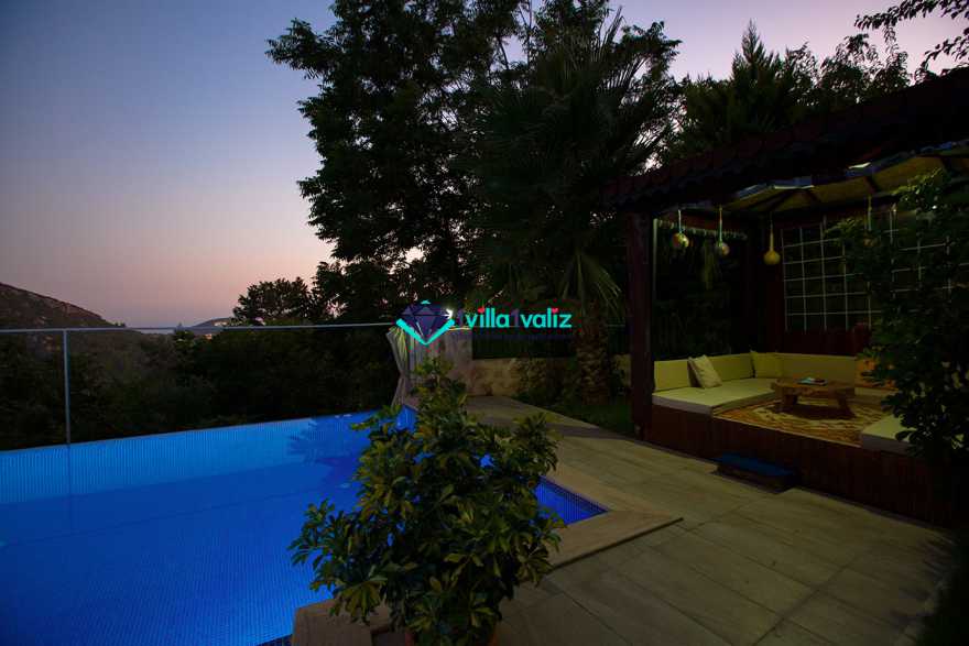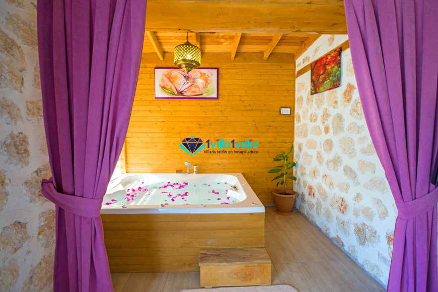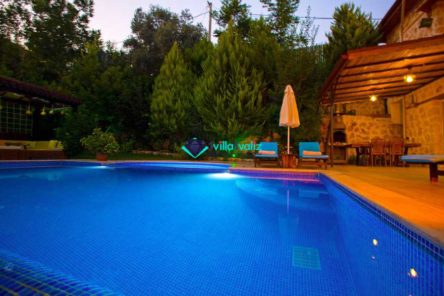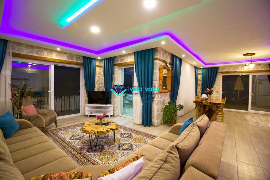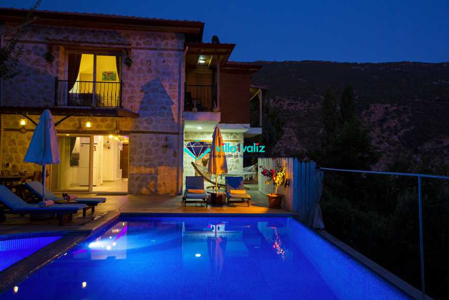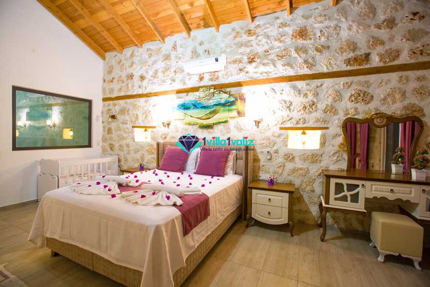 Villa Muar ; Kalkan İslamlar Köyü Mevkisi ' nde doğa içerisinde yer almakta olan taş yapımı bir tatil evidir. Yazlığımız , 2 suit yatak odası ve bir salondan oluşmakta olup , toplamda 4 kişiye kadar konaklama imkanı sağlanmaktadır. Villamızın suit ebeveyn yatak odasında etrafı ahşap ile dizayn edilerek hoş bir görünüme sahip olan büyük bir jakuzi yer almaktadır. Her iki suit odaların kendine ait özel banyosu ve tuvaleti bulunmaktadır. Yazlığımız ; Modern Amerikan Mutfaklı şık bir salona hakim olup ; salon çok modern ve kaliteli eşyalar ile dekore edilmiştir. Yemyeşil bir ortamda yer alan bu taş yapılı tatil mekanımız siz değerli muhafazakar ailelerimizin ve balayı çiftlerimizin konforu ön planda tutularak bütün ayrıntılar düşünülmüştür. Siz değerli misafirlerimizin havuz başında gönül rahatlığı ile zaman geçirmesi için havuz çevresi korunaklı hale getirilmiştir. Yabancı gözlerden uzakta , sadece sevdikleriniz ile keyifli vakit geçirebileceğiniz bir tatil yeri olan Villa Muar , sizlere kaliteli hizmet sunmak için beklemektedir. Kiralık evimizin bahçe dekorasyonunda da iç mekanda olduğu gibi bütün ayrıntılara yer verilerek dizayn edilmiştir. Mis kokulu çiçeklerle süslenen bahçemizde oturma alanı ve hamak bulunmaktadır. Yazlığımızın yakın mesafesinde market bulunması misafirlerimiz için iyi bir avantajdır.