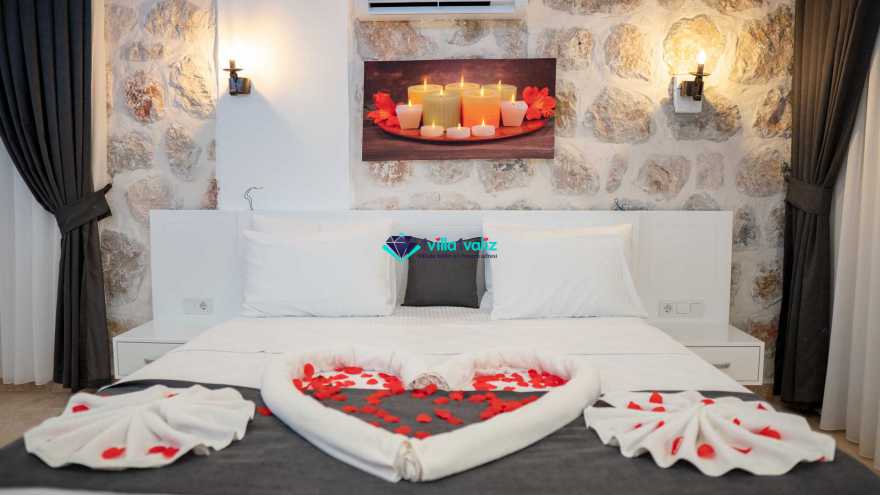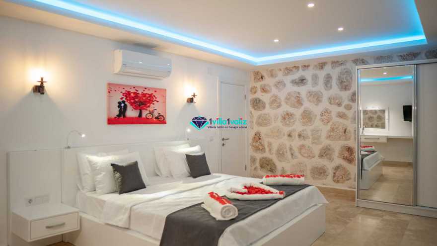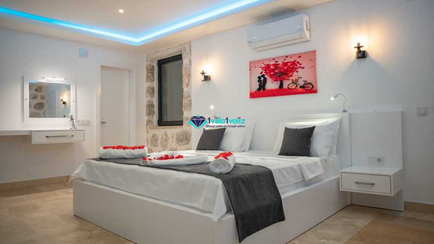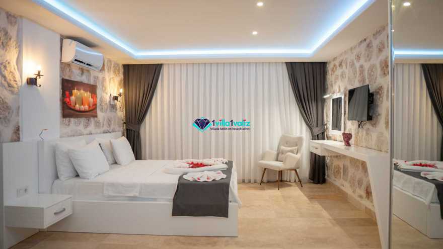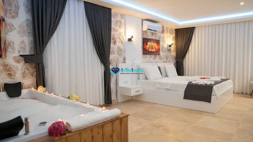 1. Yatak Odası: 1 adet çift kişilik yatak, elbise dolabı, komodin, televizyon, klima, wc , jakuzi, banyo ve balkon bulunmaktadır.