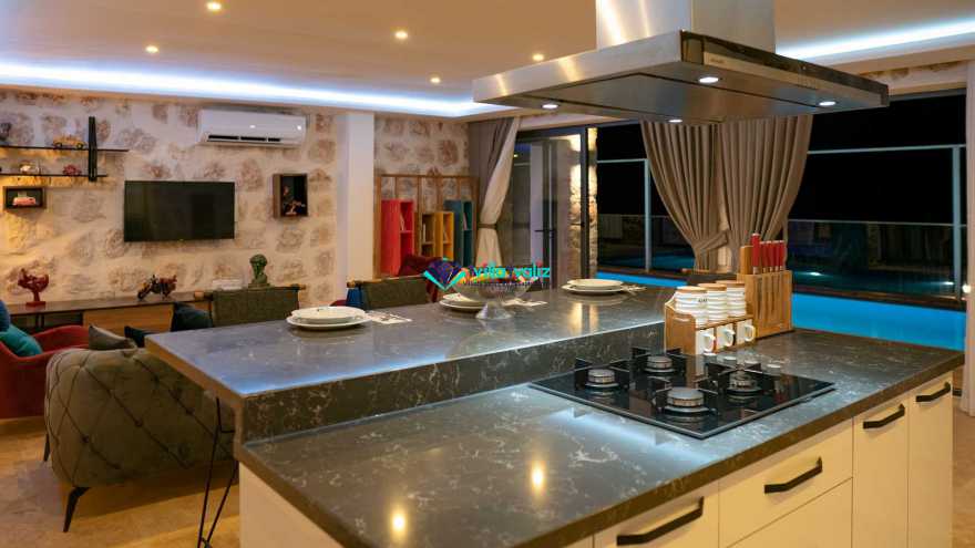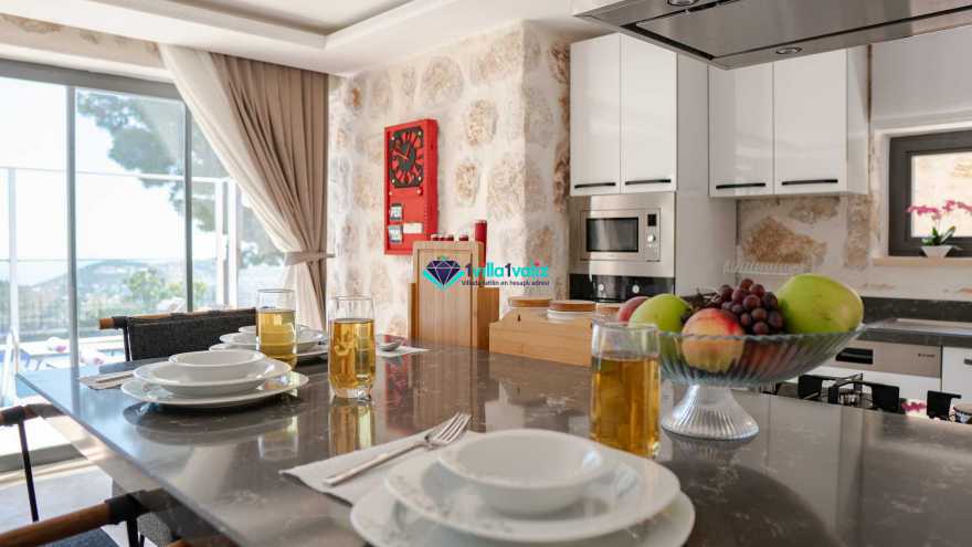 Mutfak Detayı: Bulaşık makinesi, buzdolabı, elektrikli su ısıtıcı kettle, çamaşır makinesi, fırın, 4’lü ocak, 8 kişilik yemek takımı, mikrodalga, kaşık, bıçak, çatal takımı, tencere, bardaklar ve tava takımı bulunmaktadır. Mutfaktan bahçeye çıkışımız mevcuttur.