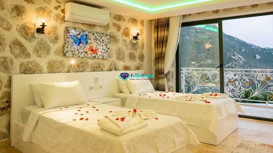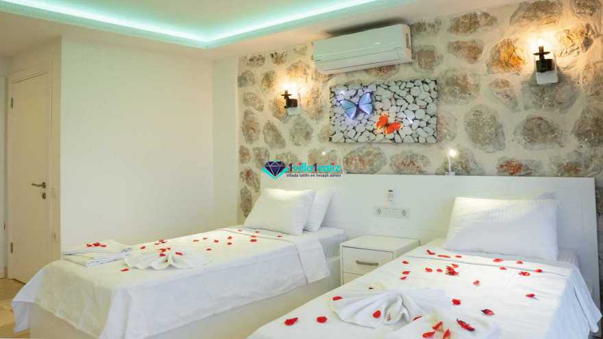 2. Yatak Odası: 2 adet tek kişilik yatak, televizyon, elbise dolabı, komodin, makyaj masası, banyo ve banyo bulunmaktadır.