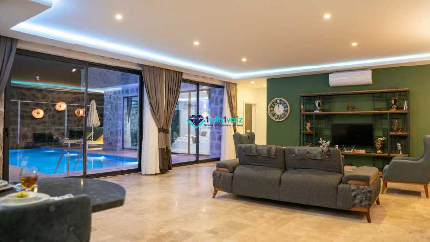 Salon Detayı: Klima, televizyon, internet, uydu alıcı, oturma grubu ve yemek masası bulunmaktadır. Salondan havuza ve bahçeye açılan bir çıkışımız mevcuttur.