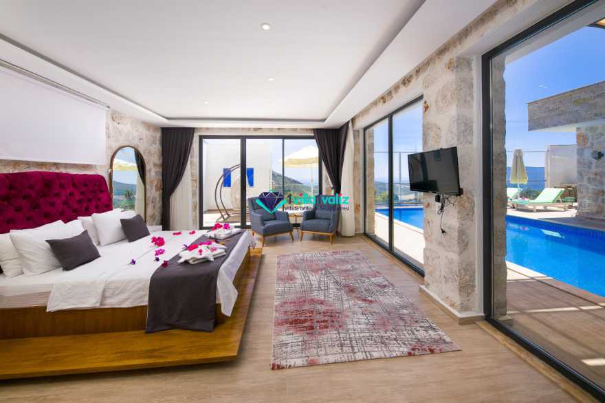 1. Yatak Odası: 1 adet çift kişilik yatak,  elbise dolabı, komodin, televizyon, klima, wc ,  jakuzi ve banyo bulunmaktadır. Odadan bahçeye ve havuza çıkış mevcuttur.