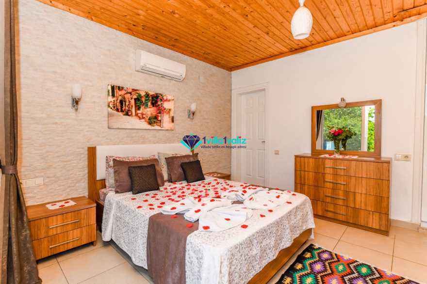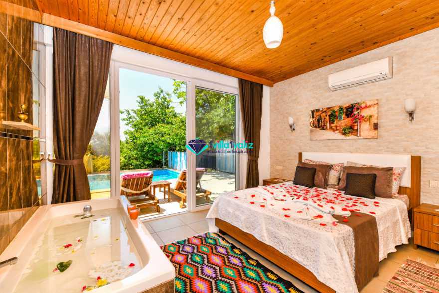 Yatak odası 1 : Çift kişilik yatak, komodin, klima, makyaj masası, elbise dolabı, jakuzi, banyo, tuvalet ve havuz terasına çıkış bulunmaktadır.