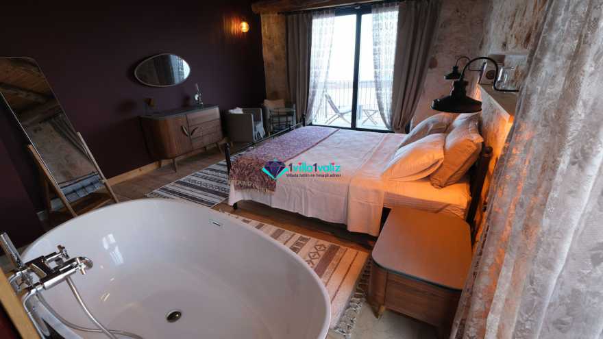 Yatak Odası 1: 1 adet çift kişilik yatak, pervane, komodin, elbise dolabı, makyaj masası, küvet, banyo ve tuvalet bulunmaktadır.