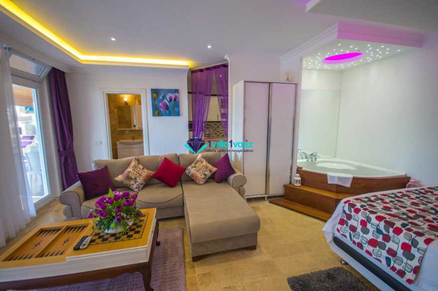 Kalkan İslamlar mevkiinde bulunan Villa Şirin, 1 suit yatak odası ile 2 kişi konaklama kapasitesine sahiptir. Balayı çiftleri için ideal olan Villa Şirin doğa manzarasıyla size huzurlu bir tatil sunmaktadır. Bahçe içerisinde jakuzili, korunaklı yüzme havuzu vardır.